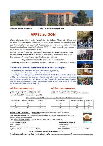 - par chèque à envoyer : au Château-Musée de Bélesta – 5 rue du château – 66720 BELESTA (ordre : Château-Musée de Bélesta)